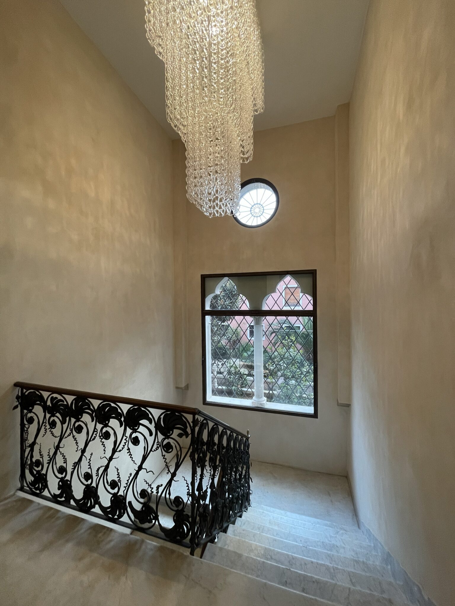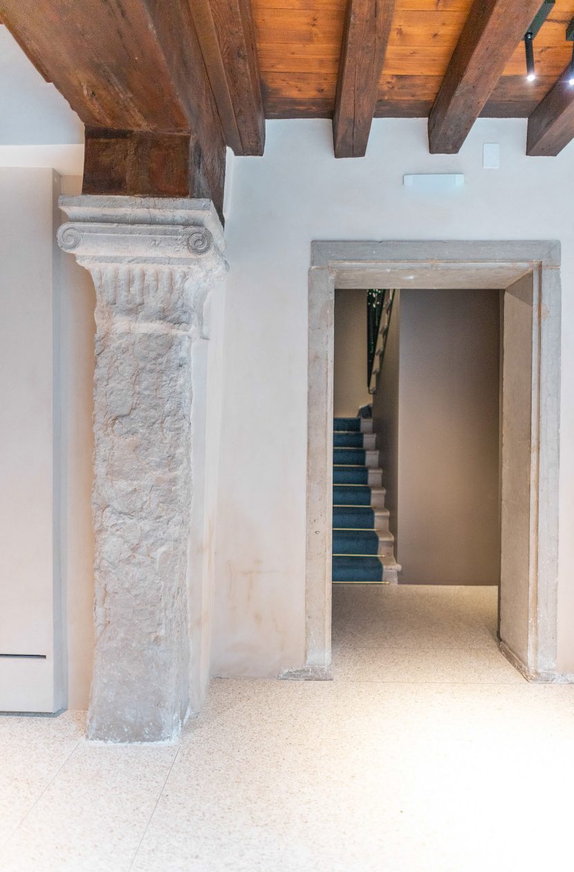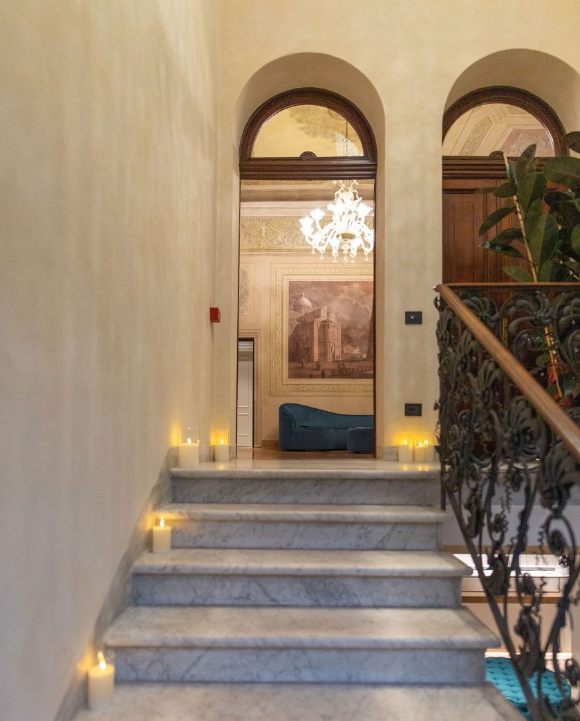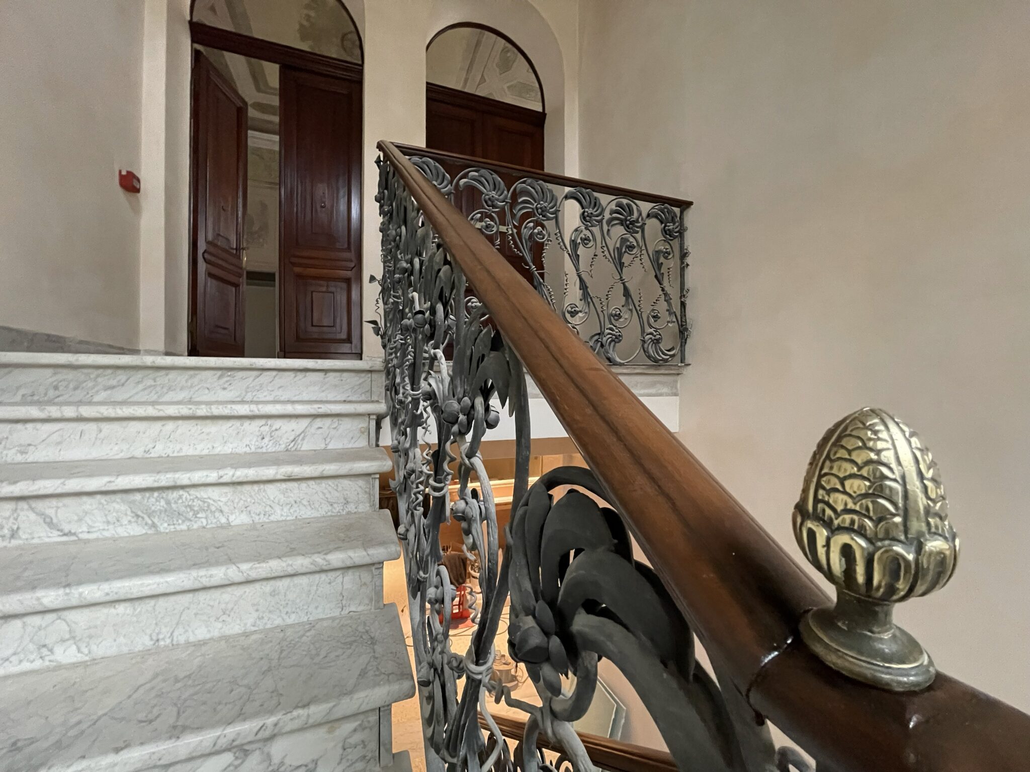 L’intervento ha riguardato il recupero architettonico, strutturale e impiantistico dell’edificio, con un approccio rispettoso della materia storica e delle stratificazioni esistenti. Particolare attenzione è stata riservata agli spazi comuni, e in particolare al vano scala, restaurato e valorizzato attraverso rivestimenti in marmo di Carrara, che ne esaltano il carattere monumentale e la continuità verticale dei percorsi.