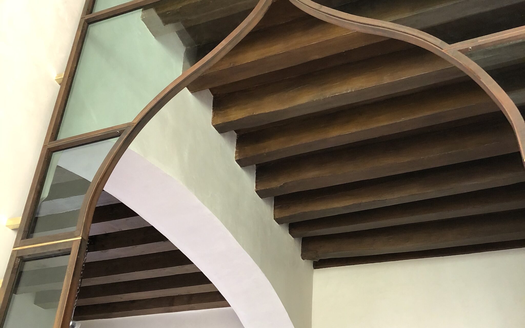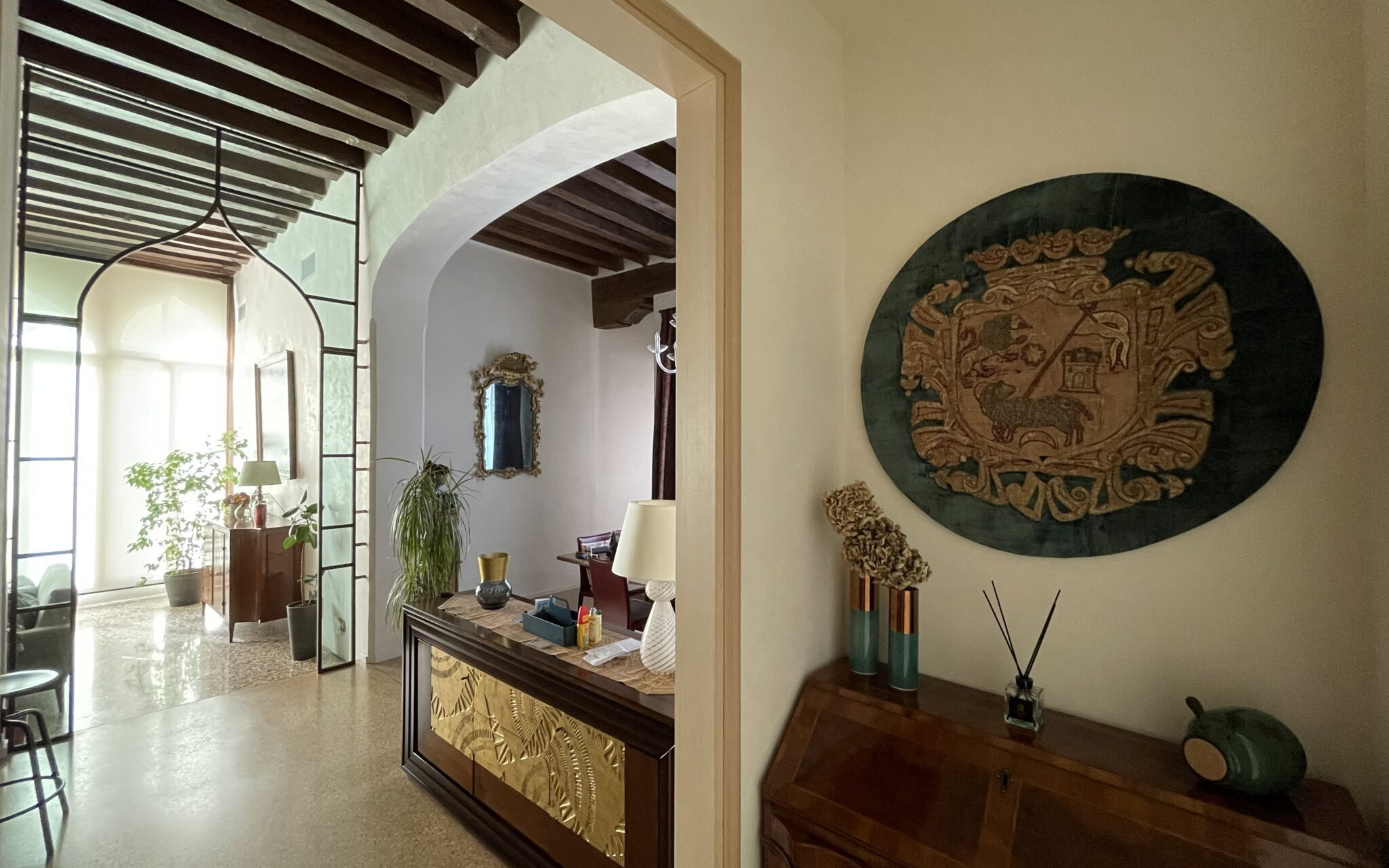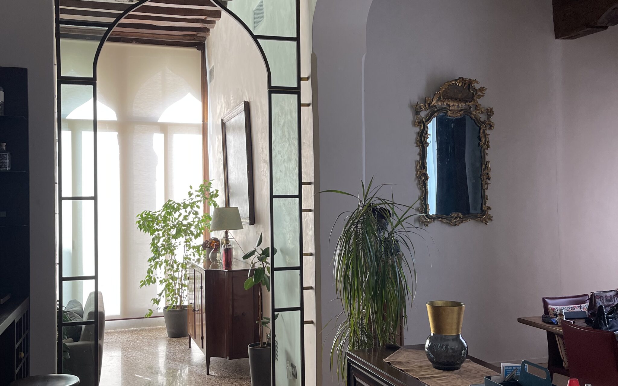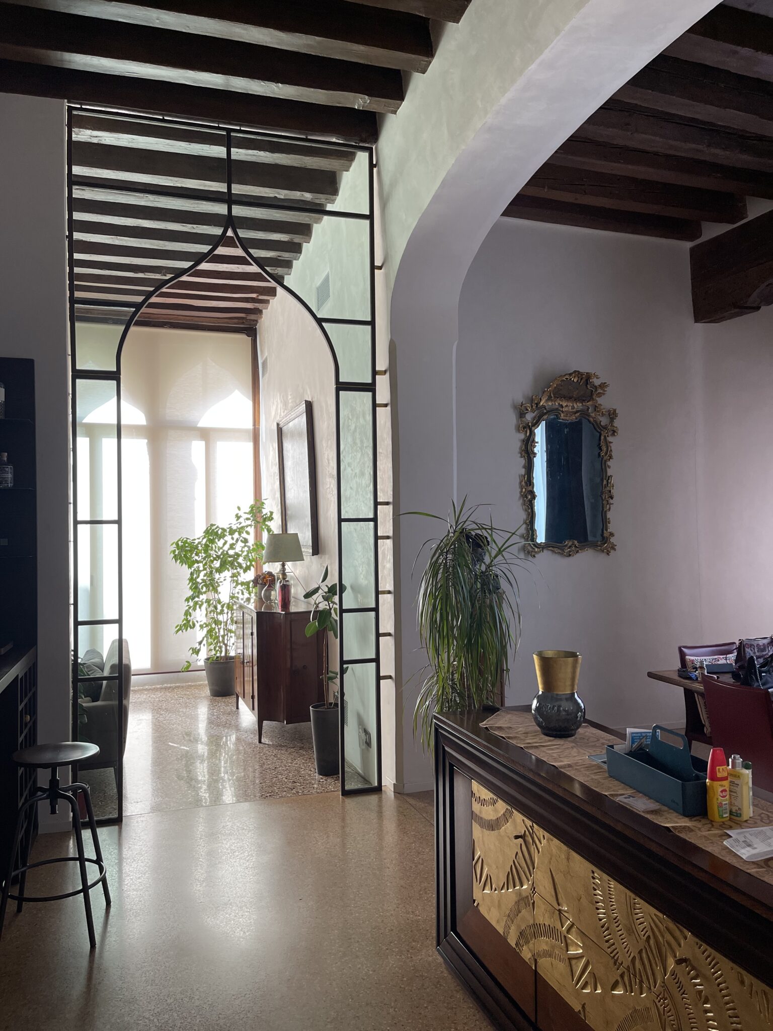 Elemento cardine del progetto è il dettaglio architettonico che fa da cornice all’ingresso del salone principale. Questa soglia assume un valore simbolico e spaziale, richiamando gli archi inflessi della pentafora bizantina della facciata storica. La geometria viene reinterpretata in chiave essenziale attraverso una struttura metallica leggera, capace di evocare il linguaggio originario.