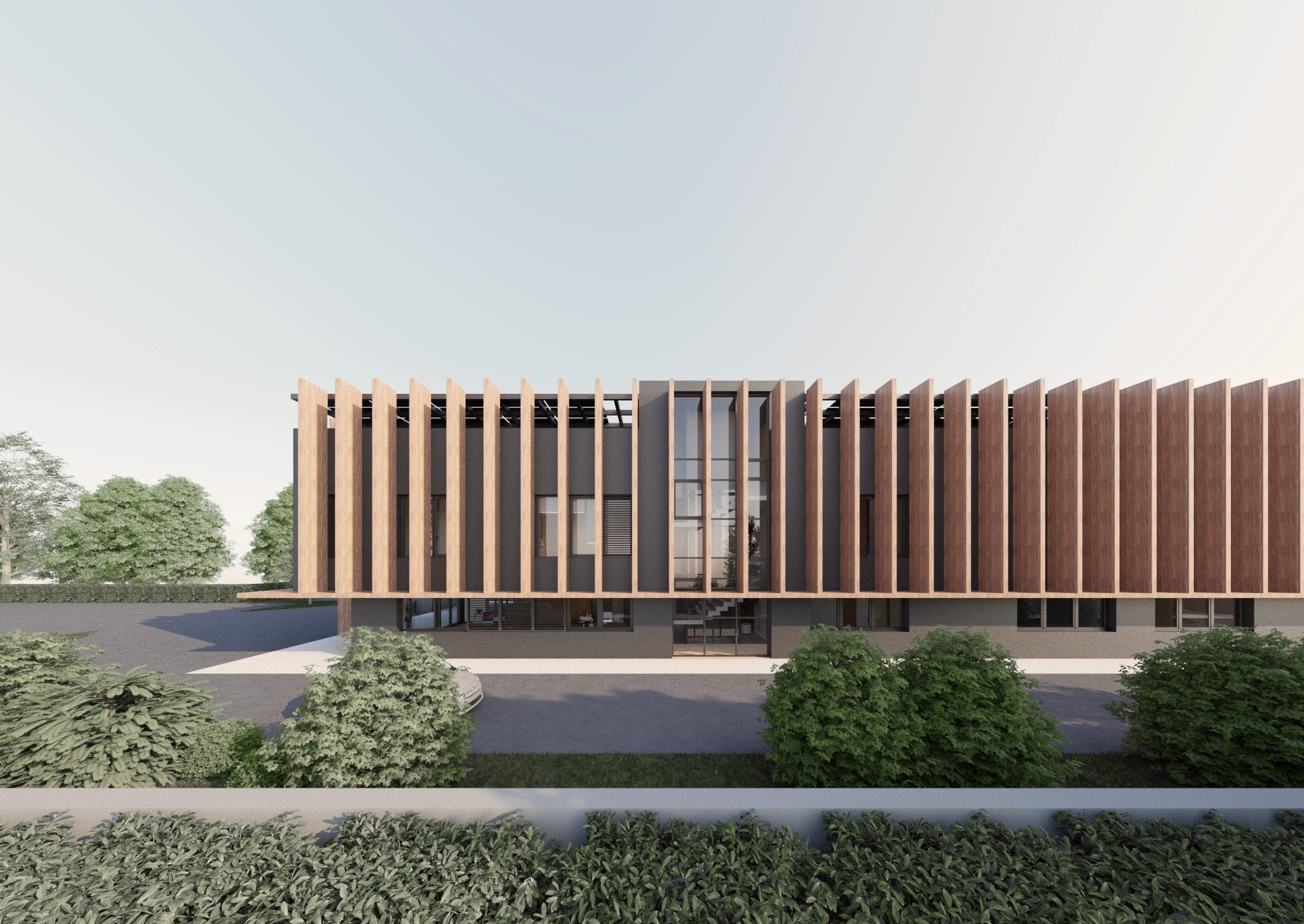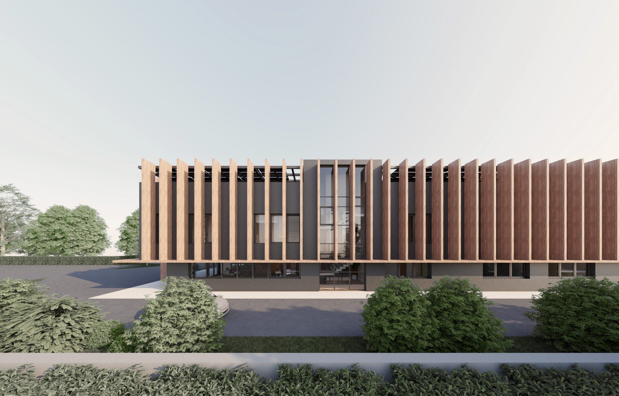 Il rivestimento esterno, scandito da elementi verticali in finitura lignea, crea un ritmo regolare che dialoga con il contesto verde circostante, mitigando l’impatto visivo della struttura e offrendo al contempo protezione dall’irraggiamento solare diretto. Le ampie superfici vetrate al piano terra favoriscono la trasparenza e la lettura immediata della composizione architettonica.