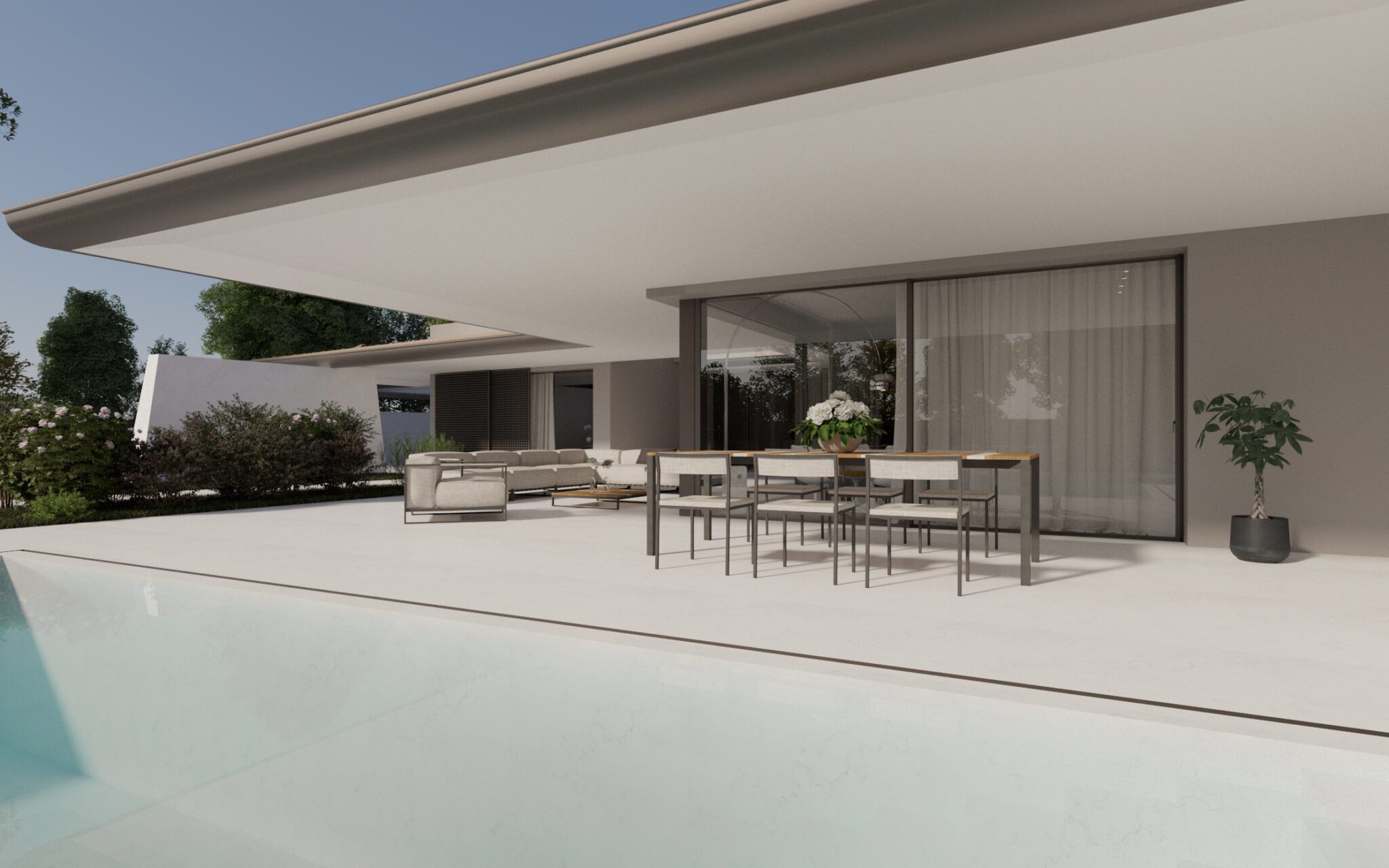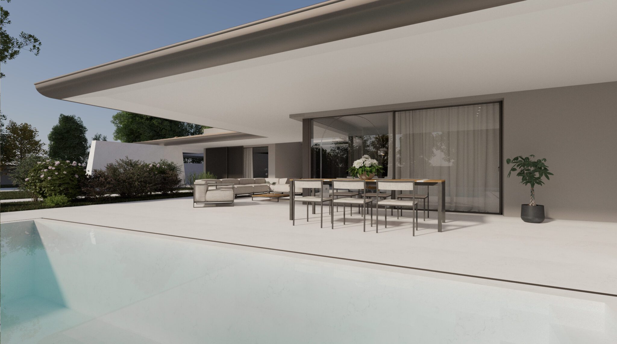 Le strutture in elevazione di tipo ibrido (blocchi Isotex e pilastri in C.A. e acciaio), unite alle particolari coperture a falde in C.A. gettate in opera con sbalzi fino a 4 metri, offrono ampie superfici vetrate o porticate che regalano viste e prospettive aperte su giardino e piscina senza soluzione di continuità.
