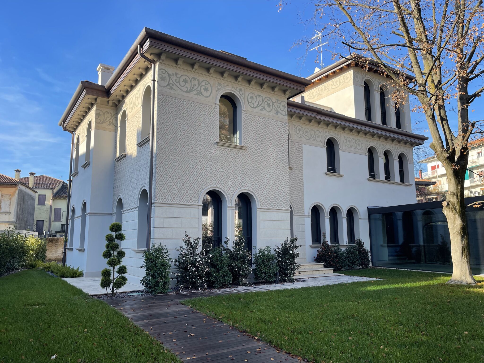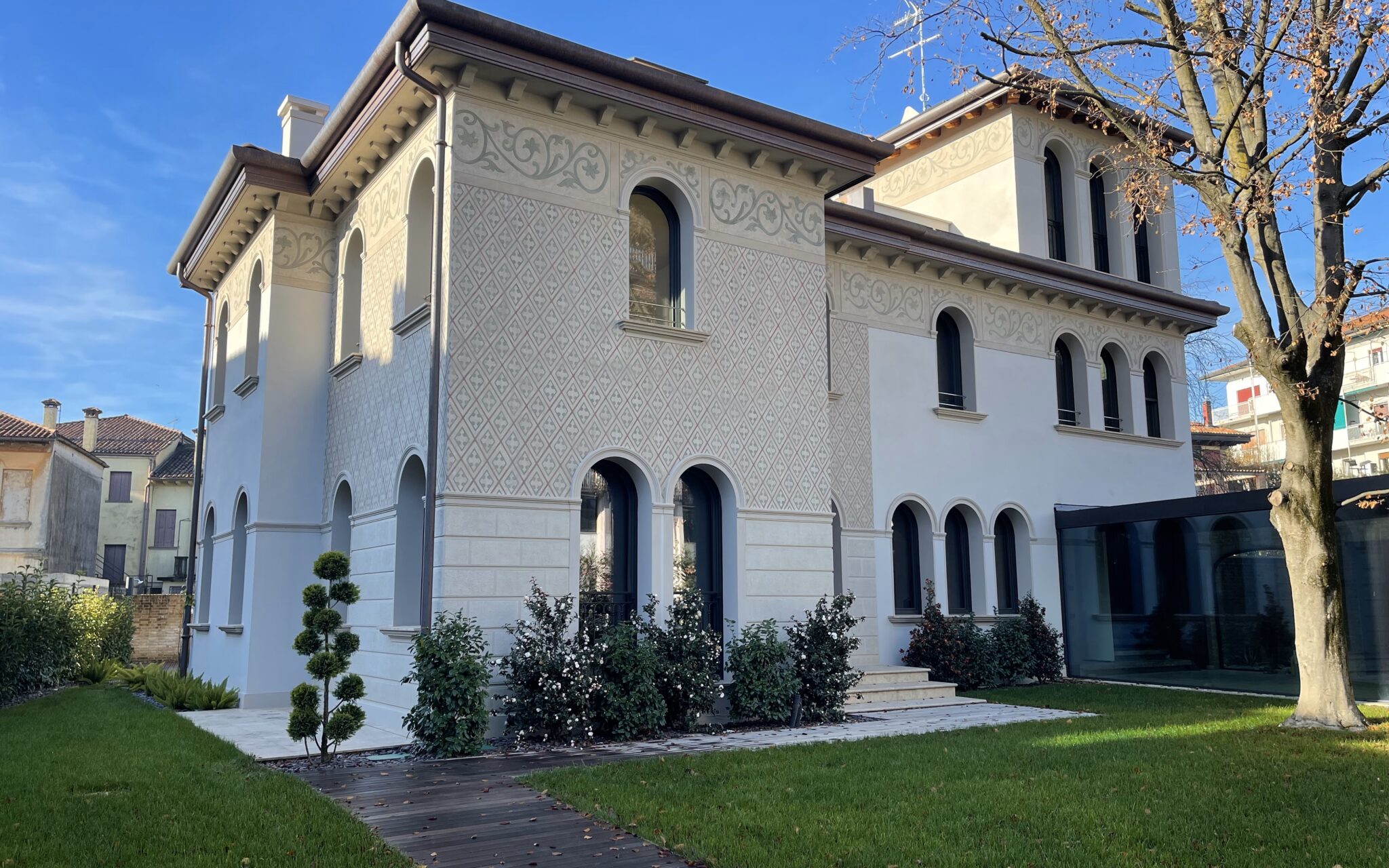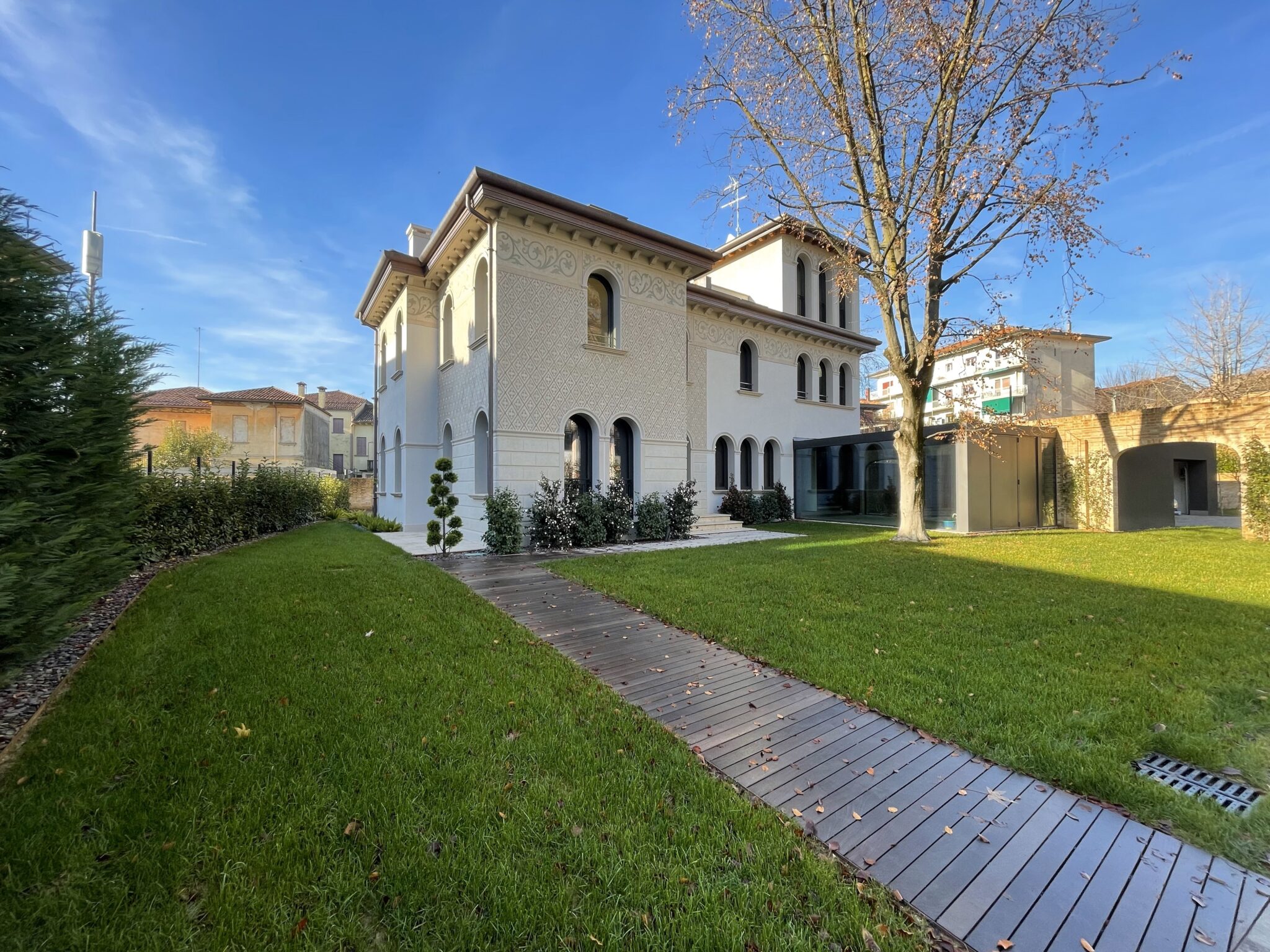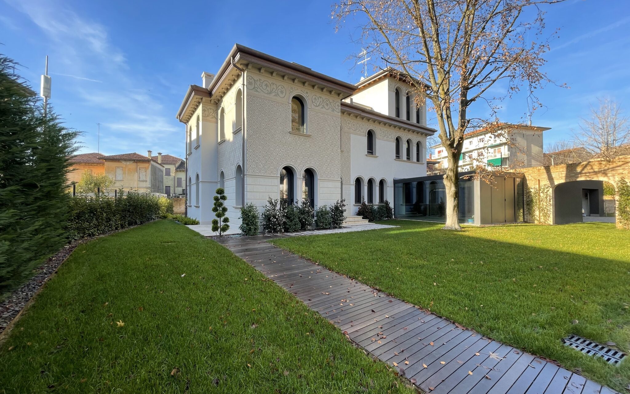 Il progetto Villa Giardino riguarda il recupero e la rifunzionalizzazione di una villa storica situata nel quartiere Città Giardino di Treviso. L’intervento è stato preceduto da un’attenta analisi dell’edificio esistente, che ha condotto a demolizioni mirate e selettive di parti incongrue, con l’obiettivo di ripristinare la volumetria, le proporzioni e il linguaggio architettonico originari della villa, caratterizzati da evidenti richiami allo stile Liberty.