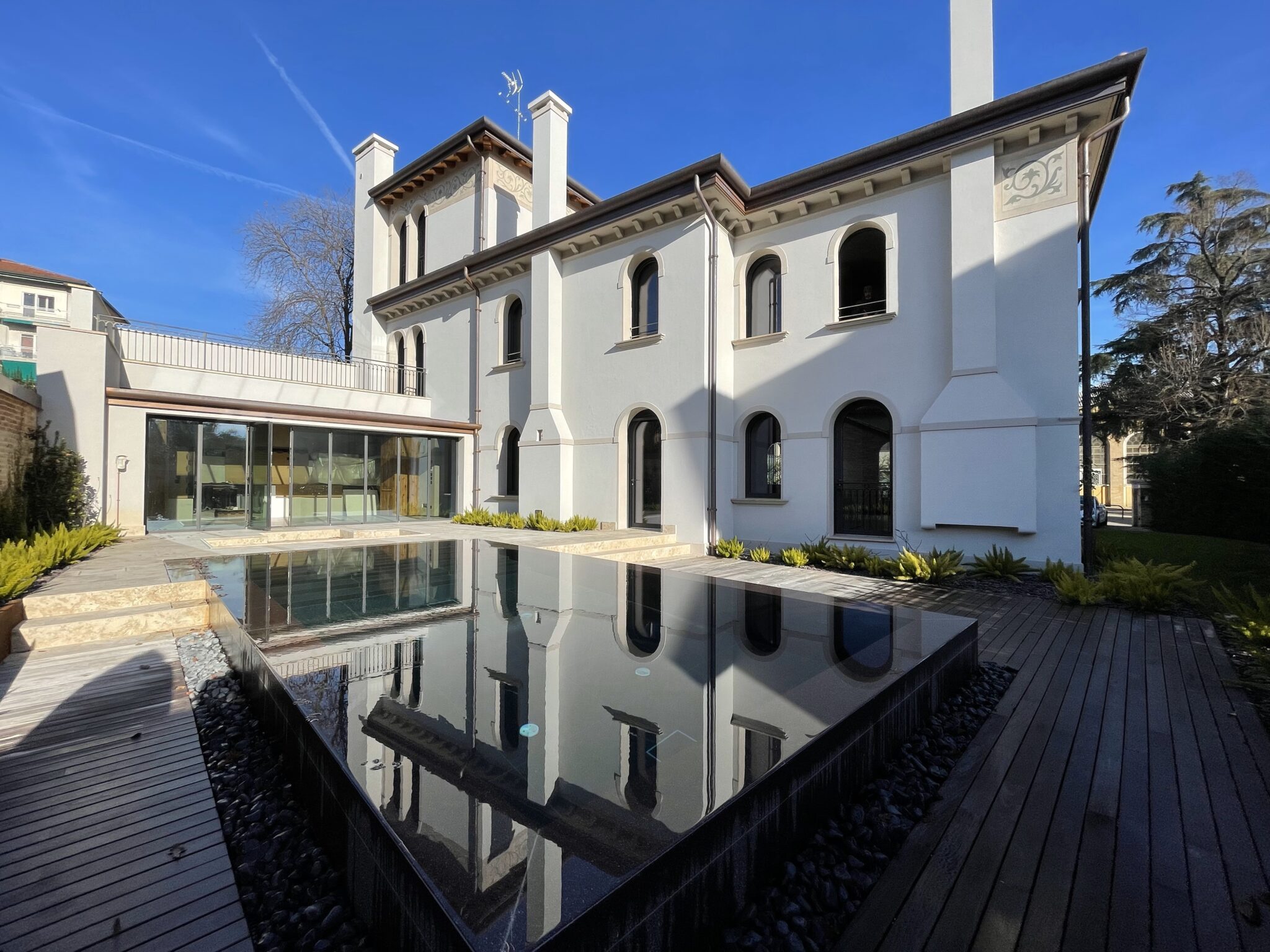 Dal punto di vista costruttivo e impiantistico, la villa è stata completamente ripensata secondo criteri di comfort ed efficienza energetica contemporanei. L’involucro edilizio, le soluzioni tecnologiche e gli impianti sono stati progettati per garantire elevate prestazioni termiche e acustiche, migliorando la qualità abitativa nel rispetto dell’identità storica dell’edificio.