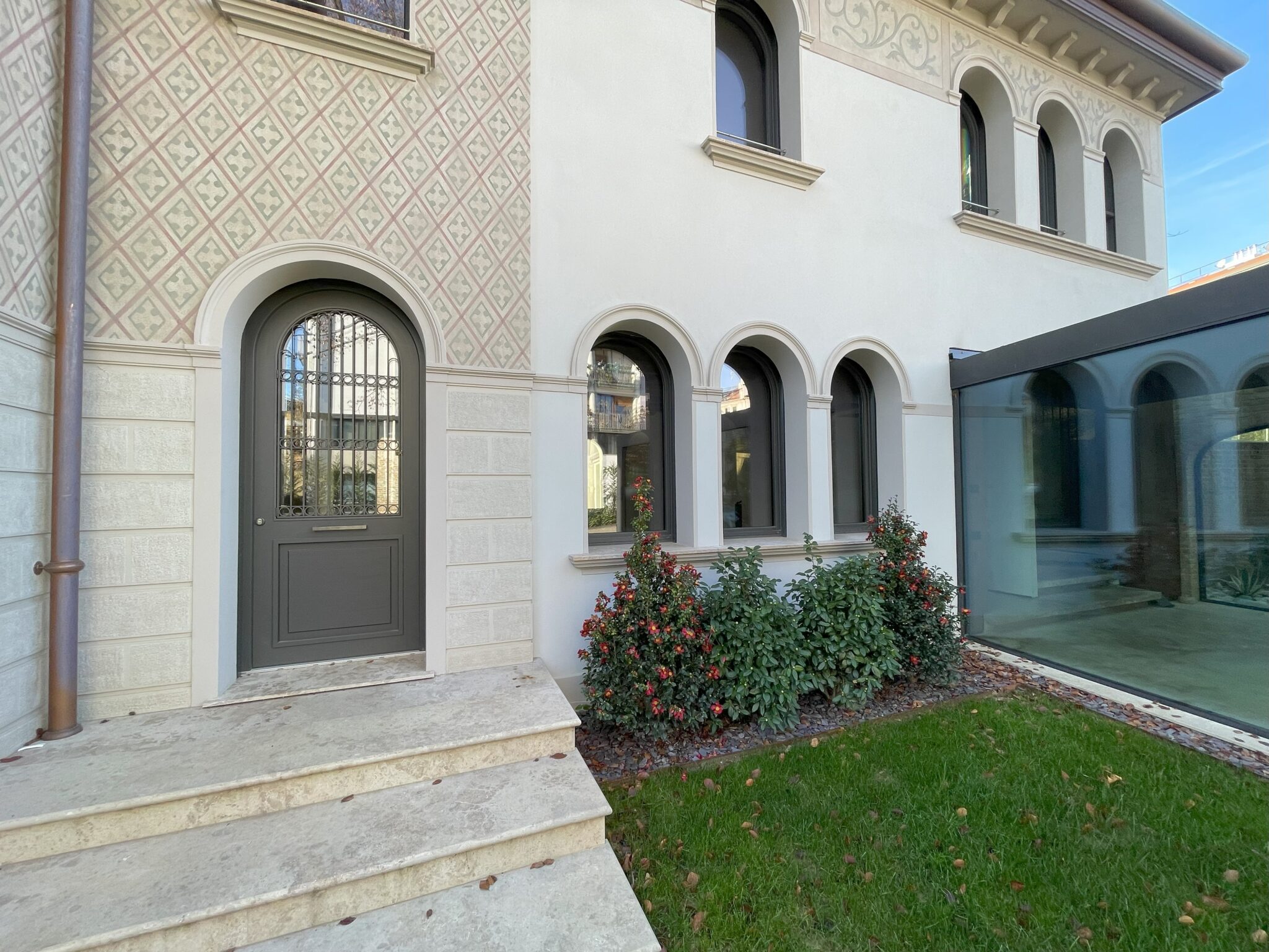 Particolare attenzione è stata dedicata al recupero e alla valorizzazione degli elementi decorativi di matrice Liberty — cornici, modanature, archetti delle aperture e motivi ornamentali delle facciate — reinterpretati attraverso un linguaggio misurato e contemporaneo. Questi dettagli contribuiscono a restituire all’edificio la sua identità originaria, senza rinunciare a una lettura attuale dell’architettura.